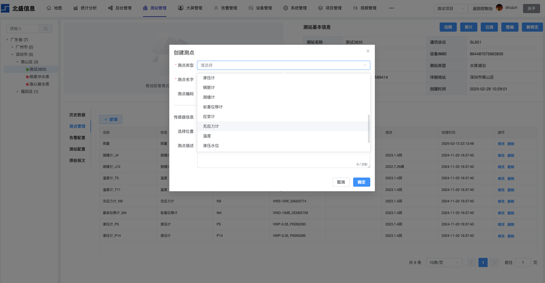 下面是我们支持的传感器列表。在平台上为测站添加测点的时候,传感器对应的参数需填写完整。