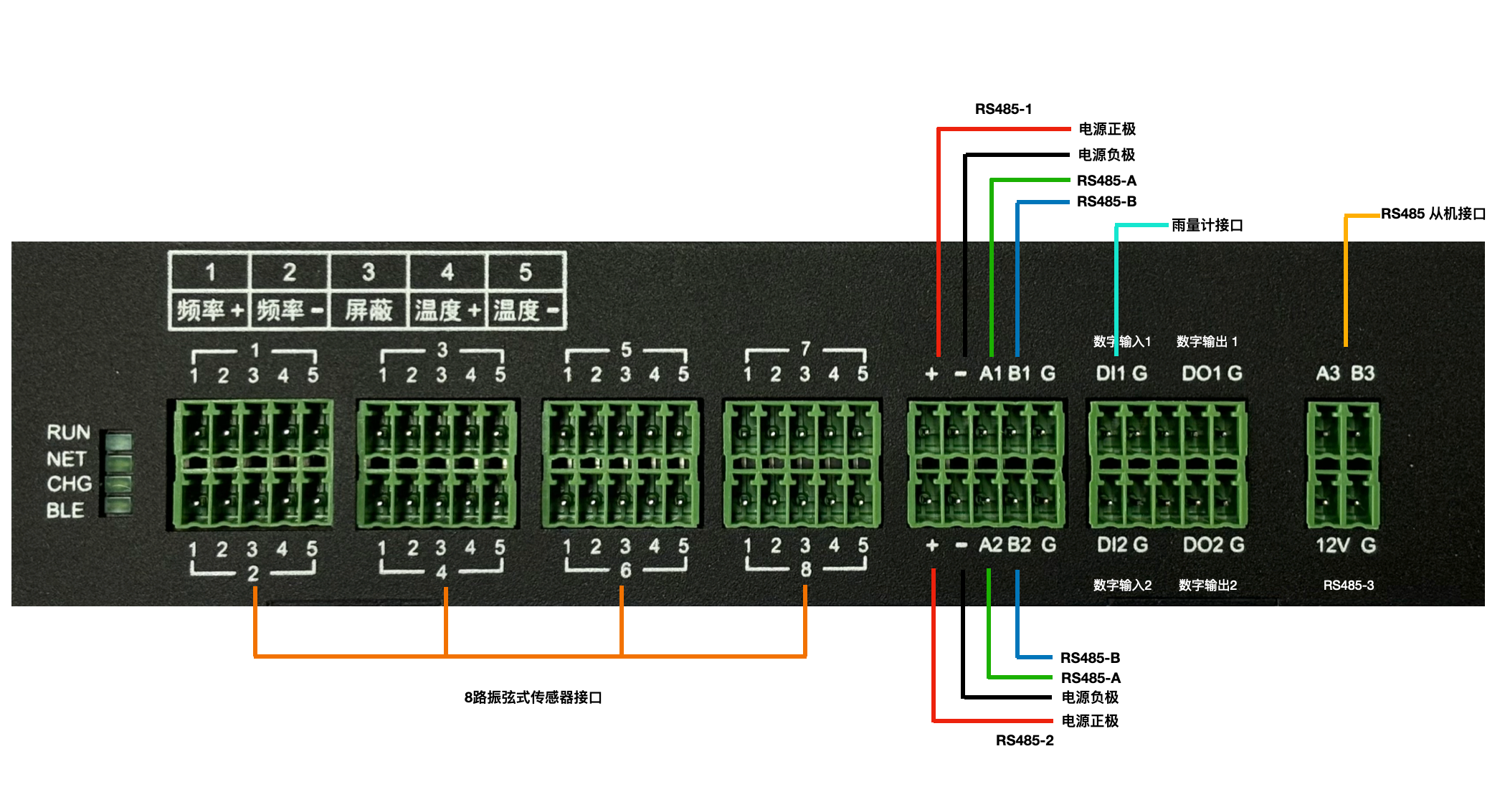 - 接口丰富:提供8 路振弦传感器接口,2 路 RS232 接口,2 路 RS485 接口,支持2 路数字 IO 输入。支持输出 4 路可控的 12V 电压。